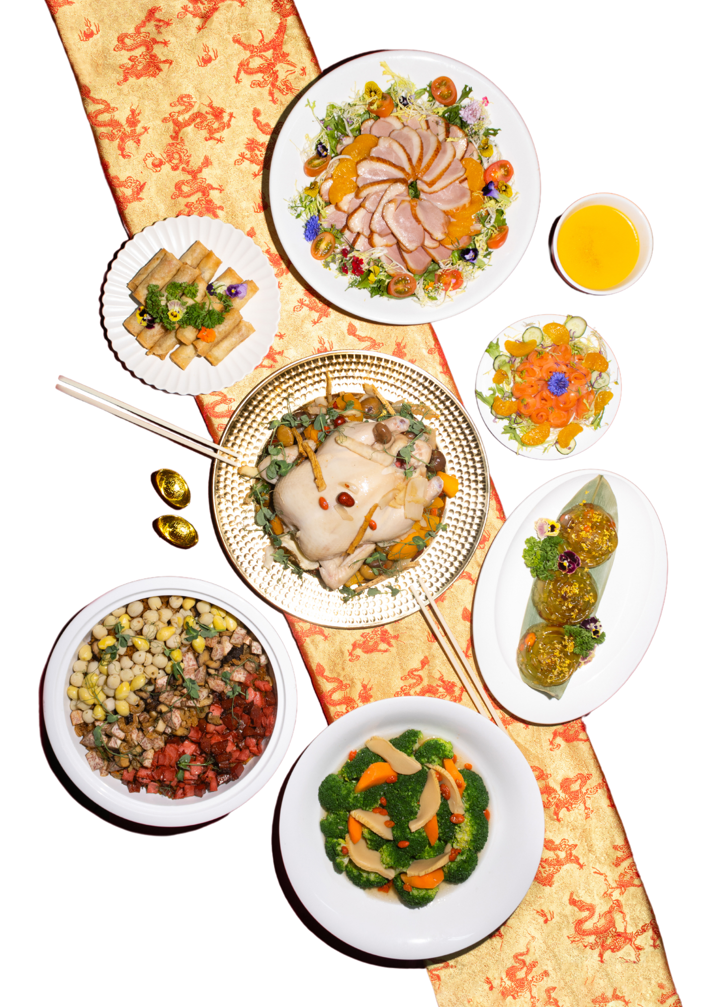 Celebrate the Year of the snake with a bountiful spread crafted to bring joy, unity, and prosperity to your gatherings. Featuring dishes like Baked Empress Chicken with Pumpkin and Chestnut, Eight-Treasure Egg Fried Rice with Chicken Ham, Purple Yam Roll with Truffle Mayonnaise, and Osmanthus Jelly with Longan & Goji Berries.
